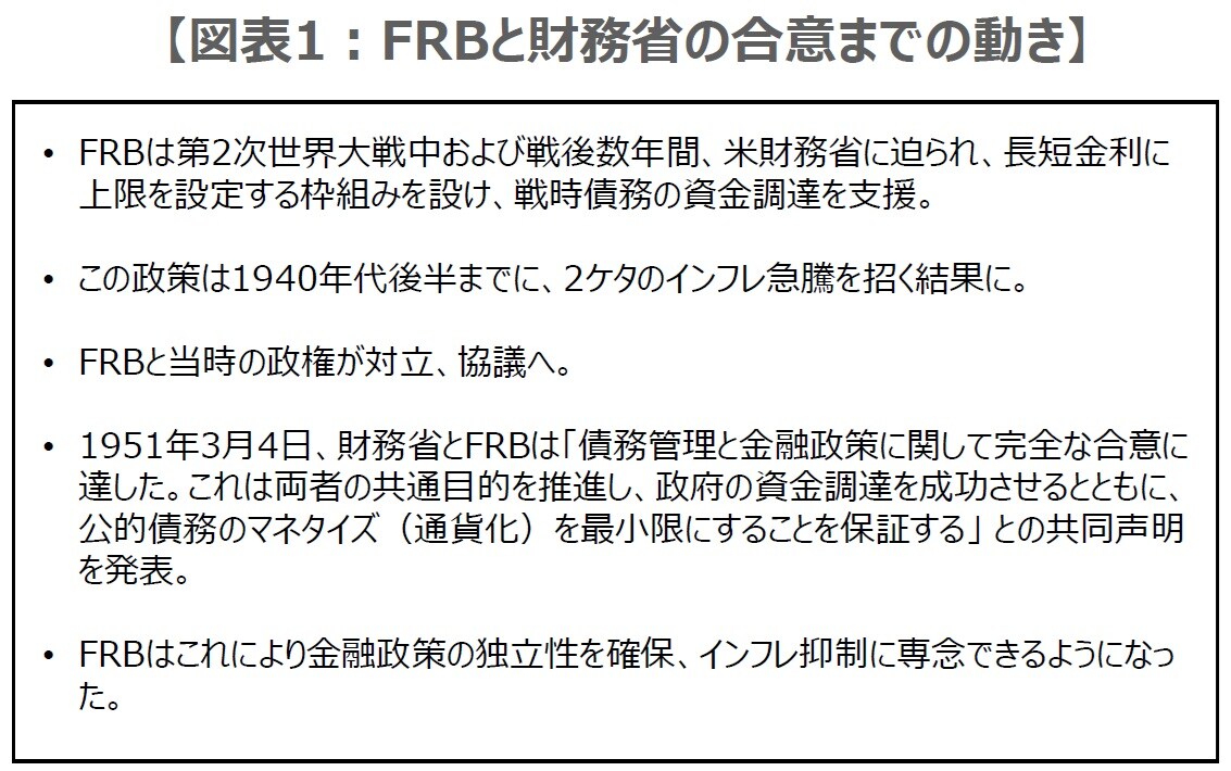 寄稿でも触れられていましたが、FRBは第2次世界大戦中および戦後数年間、米財務省に迫られ、長短金利に上限を設定する枠組みを設け、戦時債務の資金調達を支援した経緯があります。しかしながら、この政策は1940年代後半までに、2ケタのインフレ率上昇を招く結果となりました。FRBと財務省は協議を重ね、1951年3月に政府債務管理と金融政策を分離する合意に達し(図表1)、FRBは金融政策の独立性を確保できるようになりました。