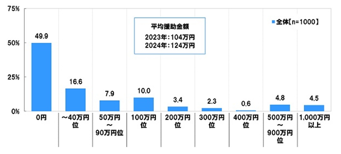 ソニー生命が公表した2024年の調査によると、祖父母が教育資金として子や孫に資金援助した平均額は124万円でした。前年(2023年)の104万円から増加しており、援助の金額が年々上昇傾向にあることがわかります。