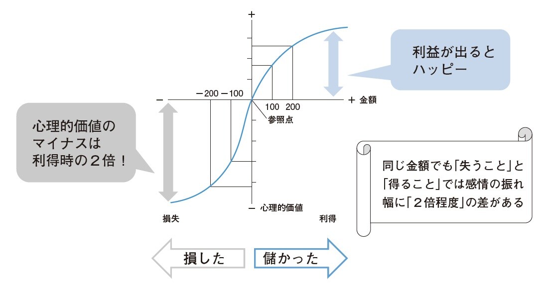 一般的に、同じ金額であったとしても、失うことと得ることでは感情の振れ幅に「2倍程度」の差があるといわれています(これを行動経済学では「プロスペクト理論」と呼びます)。人は失うことを嫌う生き物なのです。