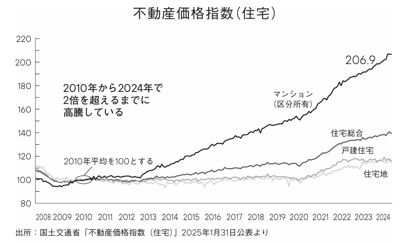 中古マンションの平均価格は国土交通省の公表した不動産価格指数(住宅)によれば、2010年を100とした場合、2024年10月時点で206.9となり、この14年間で2倍を超えるまで高騰しています[図表1]。