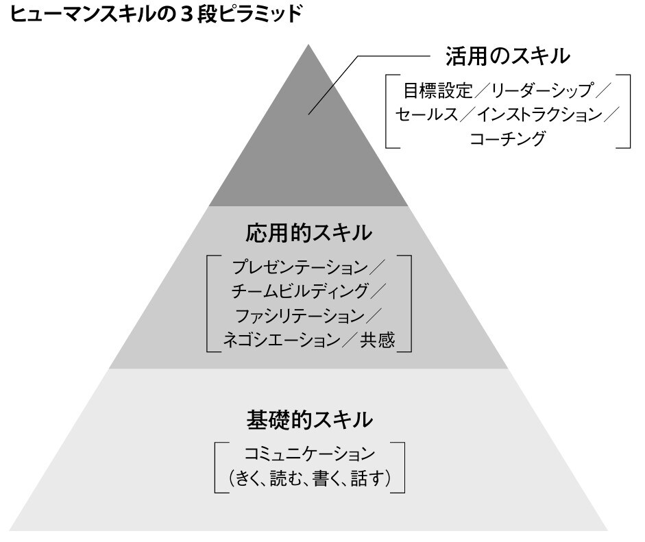 ヒューマンスキルには複数のスキルがあり、全体像としては3段のピラミッド型になっています。スキル習得の難易度はピラミッドの最上位である3段目が最も高く、土台である1段目が基礎的なスキルです。