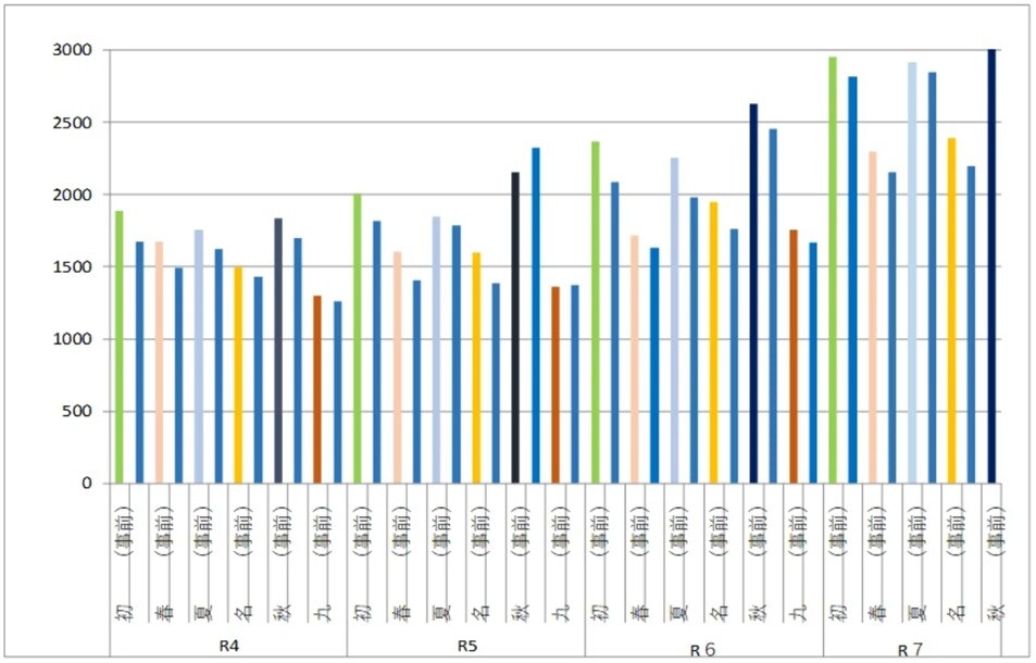 今年の名古屋場所の懸賞本数は2,196本で春場所の懸賞本数は2,152本を上回り、地方場所では過去最高になりました。その前の場所の、夏場所における懸賞本数が両国国技館開催の場所で、3連続過去最高を更新しています。