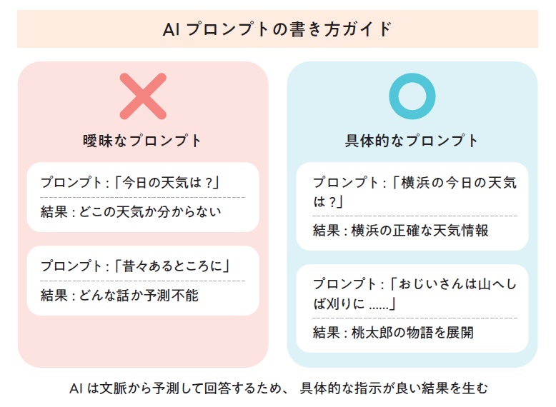 何回かに1回良い回答が出てくると言っても、良いプロンプトが書けなければ、AIはあなたの思うようには動いてくれません。例えば横浜の天気を知りたかったのに「今日の天気は?」しかプロンプトを入れないと、AIは東京の天気を答える可能性があります。