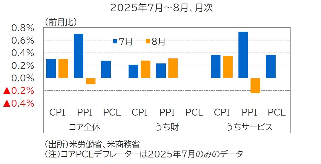 すでに公表された8月のコアCPIは前月比+0.3%と7月から小幅ながら伸びが鈍化したほか、コアPPIは前月比▲0.1%と4ヵ月ぶりにマイナスに転じました(図表2)。これらの結果をもとに推計される8月のコアPCEデフレーターは同+0.2%になることが予想されています。