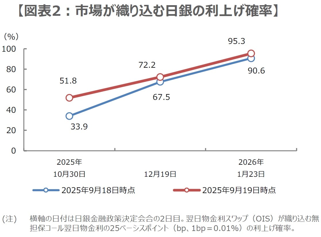 政策金利の据え置きに2名の審議委員が反対し、また、ETFとJ-REITの売却が決定されたことから、国内市場では、金融正常化が今後さらに進むとの思惑が強まり(図表2)、長期金利上昇、ドル安・円高、株安の動きがみられました。ただ、植田総裁の記者会見における発言からは、早期利上げに前向きな様子はうかがえず、弊社は次の利上げ時期について、来年1月との見方を維持しています。