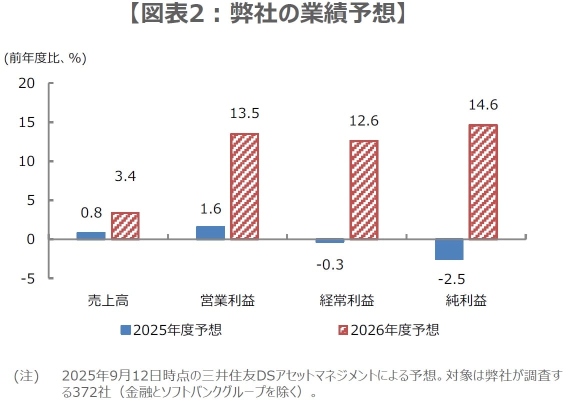 同じく、この372社について、弊社の2025年度の業績予想は、前年度比で売上高が0.8%増、営業利益は1.6%増、経常利益は0.3%減、純利益は2.5%減となっており、経常利益と純利益は減益を見込んでいます(図表2)。ただ、2026年度については、前年度比で売上高が3.4%増、営業利益は13.5%増、経常利益は12.6%増、純利益は14.6%増と、増収増益を予想しています。