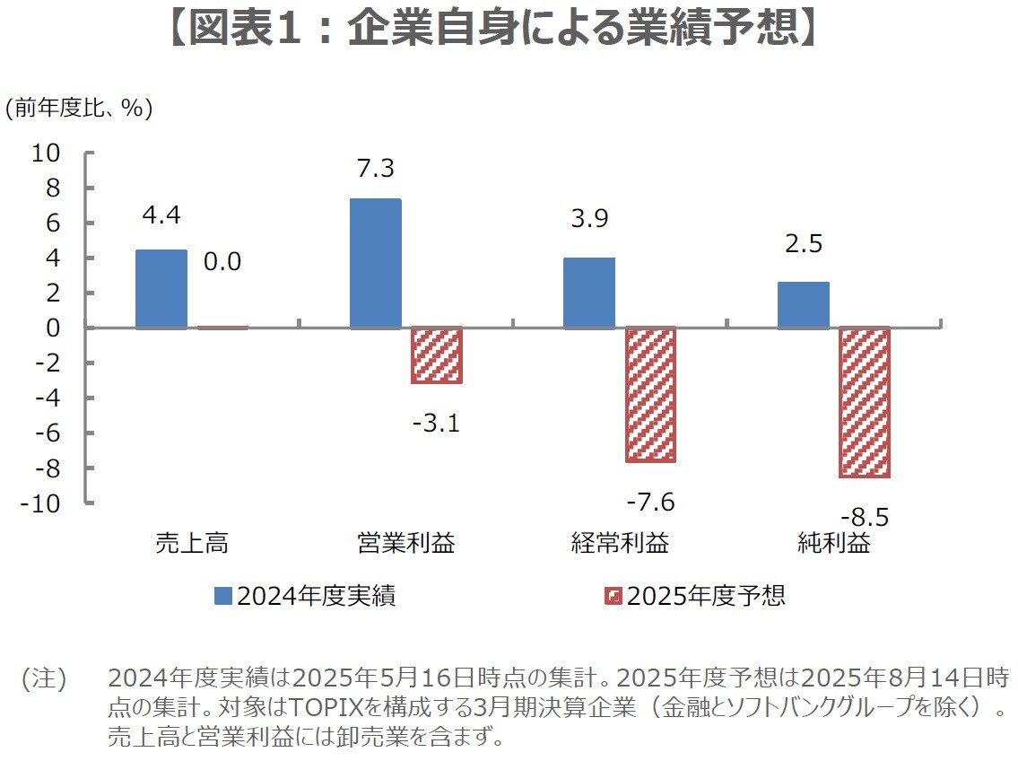 次に、2025年度の企業自身による業績予想に目を向けます。2025年4-6月期の決算発表が一巡した2025年8月14日時点の集計によると、売上高は前年度比ほぼ横ばい、営業利益は同3.1%減、経常利益は同7.6%減、純利益は同8.5%減と、厳しめの予想が示されました。これについては、トランプ米政権の関税引き上げによる景気や業績の先行き不透明感の強まりが、主に影響していると推測されます。