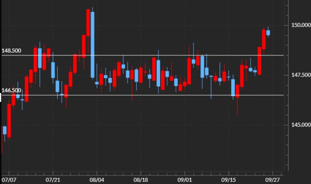 9月の米ドル/円は、前月から146円台半ば〜148円台半ばの狭いレンジ内で小幅な値動きが続いていましたが、月末にかけてこのレンジを上抜ける展開となりました(図表1参照)。