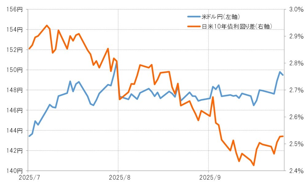 それにしても、8月以降は日米金利差(米ドル優位・円劣位)が比較的大きく縮小しました。これは、日本が利上げの方向性を示す一方で、米国は利下げを再開するなど日米で逆向きの金融政策が進んでおり、それにともなう金利差の変化によるものでしょう。