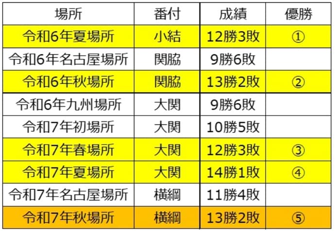 横綱2場所目の大の里は優勝インタビューで「先場所、苦しい経験をして、もうあの経験は2度としたくないと、稽古に励んで、今日こうやって2場所目で優勝することができてうれしいです」と述べています。大の里は、初の三役となった令和6年夏場所、小結で初優勝しました。それ以降、9場所で5度の優勝を果たしています。