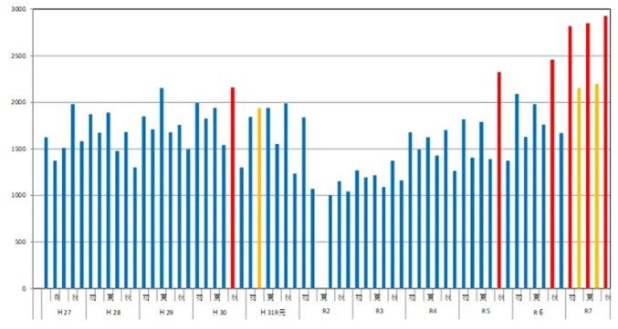 ※過去最多(赤色)平成30年秋場所2,160本を更新したのは令和5年秋場所2,325本、さらに令和6年秋場所2,455本。令和7年初場所場所2,815本、令和7年夏場所場所2,849本、令和7年秋場所場所2,926本で史上最高更新。