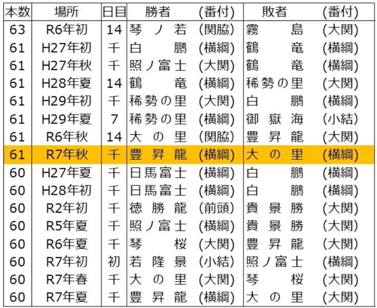 秋場所千秋楽結びの一番、東の横綱・大の里と西の横綱・豊昇龍の取組に懸かったのは、61本でした。NHKの放送ではアナウンサーが60本といっていましたが、ファン投票1位の森永賞が加わり61本と、特別な事情がない限り、東京場所での最高本数が懸かりました。