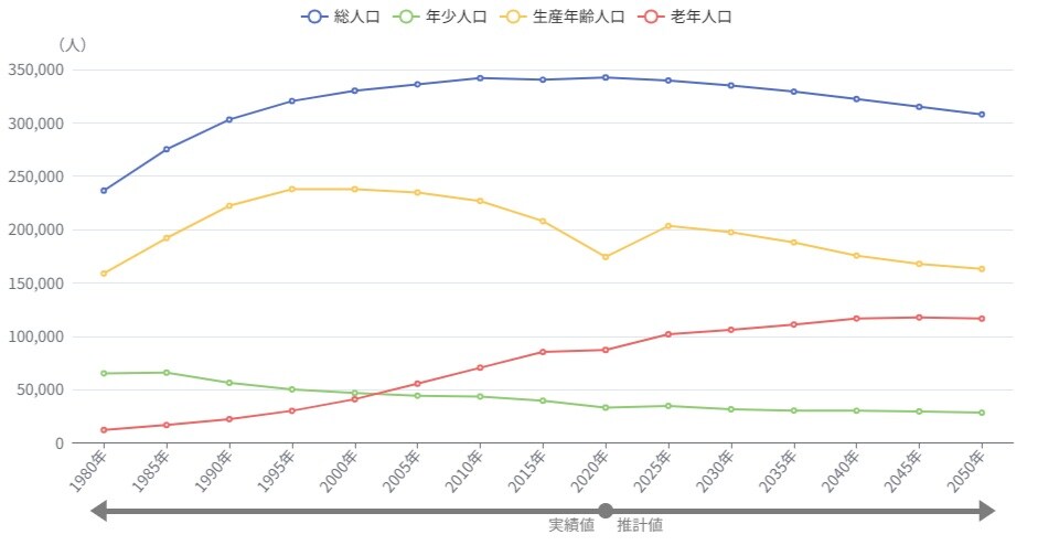 そんな「狭山ヶ丘」駅周辺の将来性を考えていきましょう。所沢市の総人口は2018年をピークに、今後は緩やかな減少に転じると推測されています。市の推計では2026年度には34万人を割り、2050年には約30.8万人になるというデータもあります。しかし、その減少カーブは全国平均と比較すると緩やかであり、人口の急減リスクは低いと考えられます[図表3]。