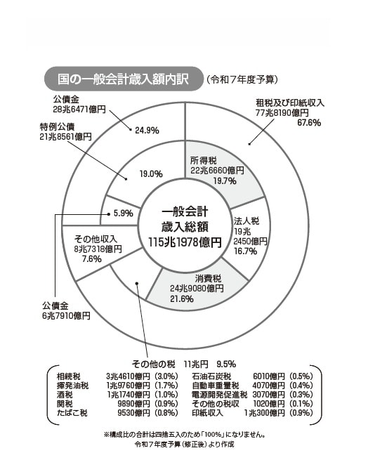 これは、国や地方公共団体の予算のうち、収入の部分(歳入)の内訳を見ればわかります。下記は、令和7年度の国の予算案をグラフにしたものですが、地方公共団体でも同様の内訳がホームページなどで公開されているはずです。