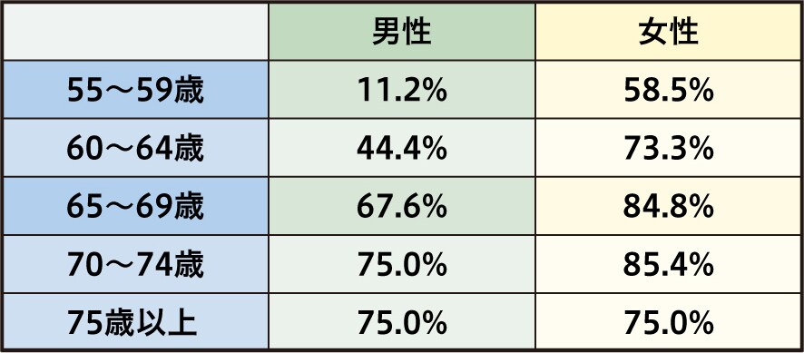 さらに2023年の60歳以上の就業者の割合は、半数以上が60代の男性です。70代前半でも、半数近くの女性が働いています。