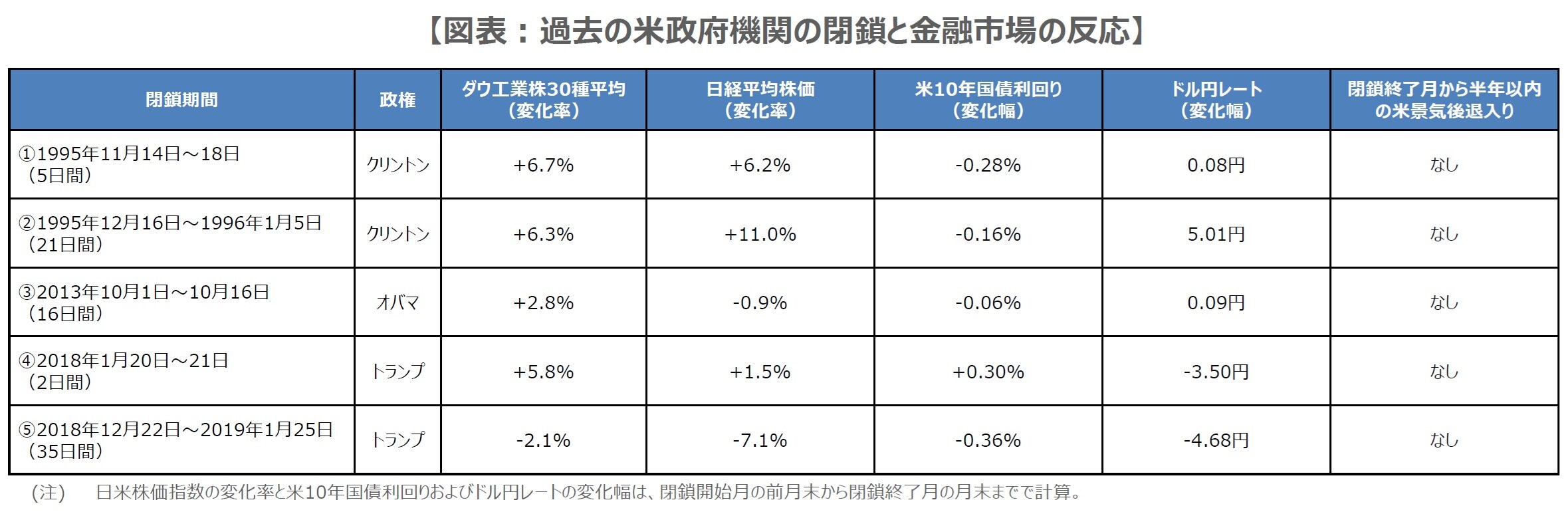 トランプ米大統領は現状、政府機関の閉鎖にあまり危機感を抱いていないように見受けられ、また、民主党も党内のリベラル派への配慮から、つなぎ予算に安易に妥協できない状況にあり、閉鎖が長引くリスクもあります。ただ、過去の例をみる限り、閉鎖がある程度長期化しても、金融市場や経済が大きく混乱する事態には陥っていません(図表)。そのため、閉鎖の長期化リスクは残りますが、現時点で過度に懸念する必要はないと考えています。