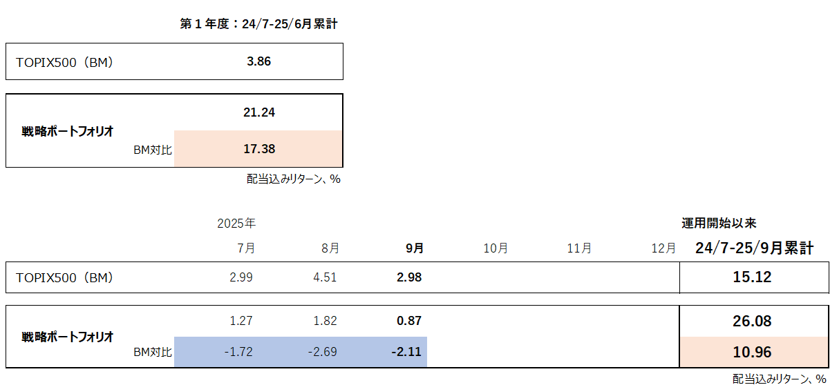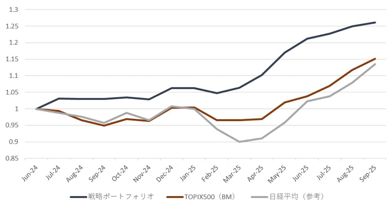 9月の戦略ポートフォリオのリターンはベンチマークに劣後した。AI関連銘柄が棒上げする相場についていけなかった。
