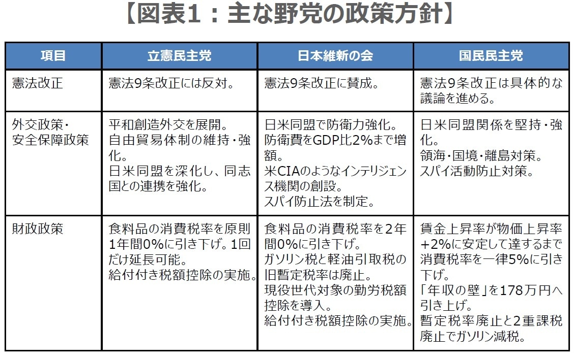 野党との連携では、考え方の合う政党と連立ができたら嬉しいと述べ、具体的な項目として、憲法の改正、外交政策、安全保障政策、財政政策を挙げました。野党のなかで、連立の相手先としてよく名前の挙がるのは、立憲民主党、日本維新の会、国民民主党です。前述の項目に関する各党の方針をみる限り(図表1)、日本維新の会と国民民主党が、連立の交渉相手になる可能性が高いように思われます。