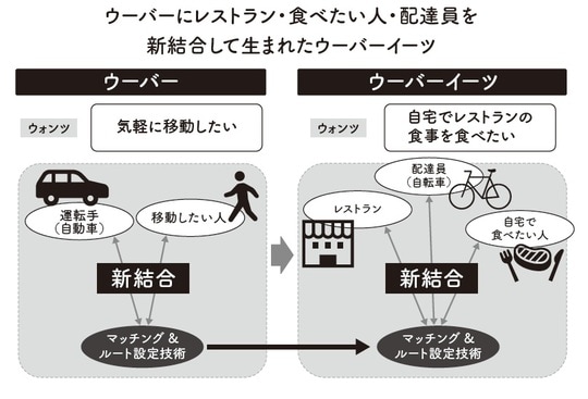 「あれ? ウーバーって、もともと自分のクルマで稼ぎたい人と、移動したい人を繫げる配車アプリよね。この仕組みを使って、料理を宅配したい店と配送員を繫げて、私もこうして自宅でステーキを食べられるわけか……。これって、ウーバーの配車の仕組みを、食事のデリバリー用に新結合しているってことよね……」