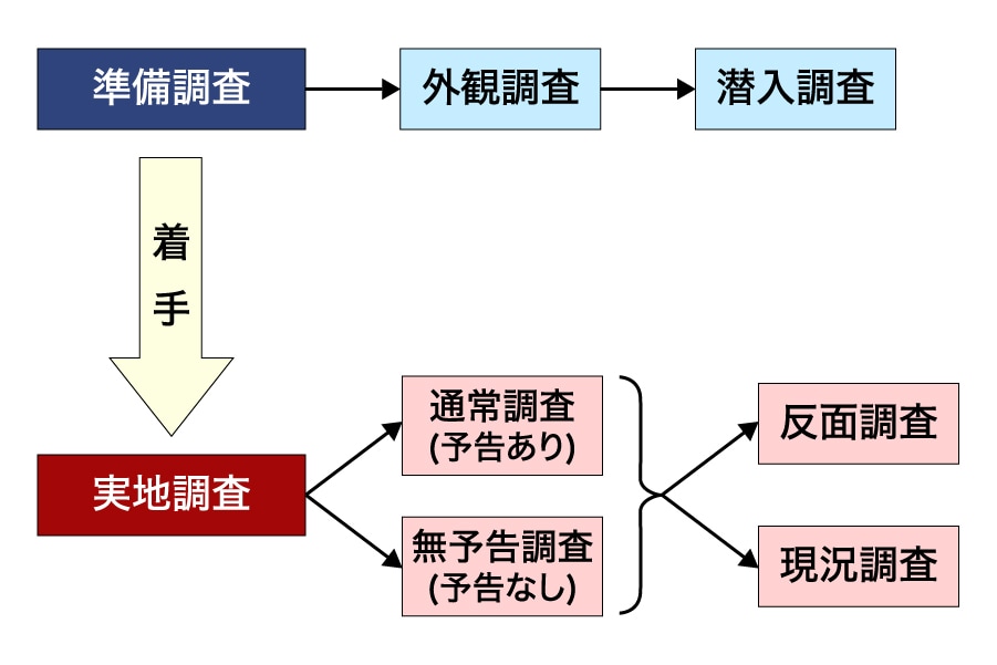 準備調査で得た情報をもとに、実際に会社や自宅を訪問して行うのが実地調査です。実地調査にはさらに複数の形態があります。