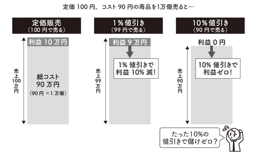 「たった1%の値引きで、利益は10万円から9万円、つまり10%も下がりマス!」