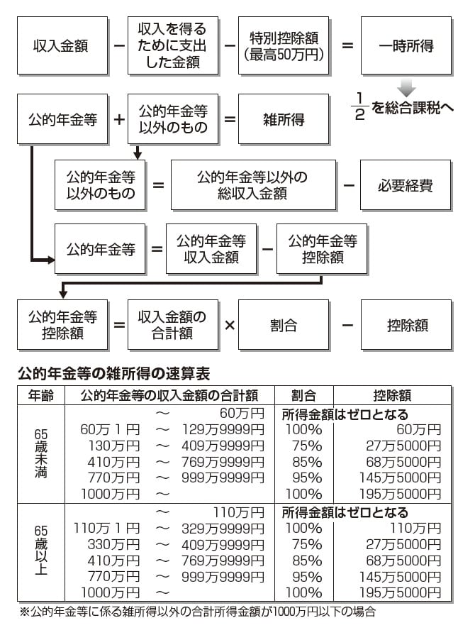 また、懸賞金や拾ったお金の報労金などの臨時収入は「一時所得」です。自分が保険料を支払った保険の満期金なども、一時所得になります。一時所得は、図表2の計算式の所得金額の、2分の1だけが総合課税の対象になります。