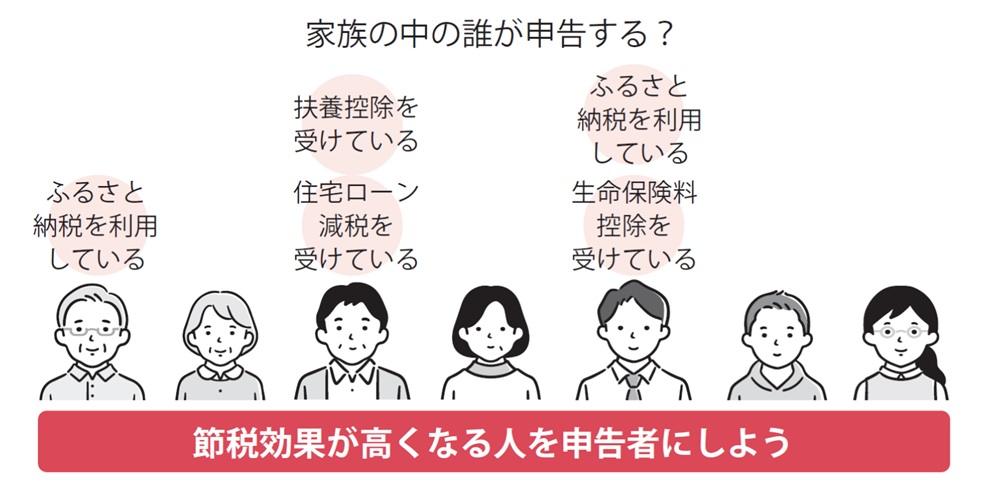 扶養控除やiDeCoや小規模企業共済等掛金控除、生命保険料控除、住宅ローン減税、ふるさと納税などを活用している場合、どの家族が申告するか慎重に判断する必要があります。