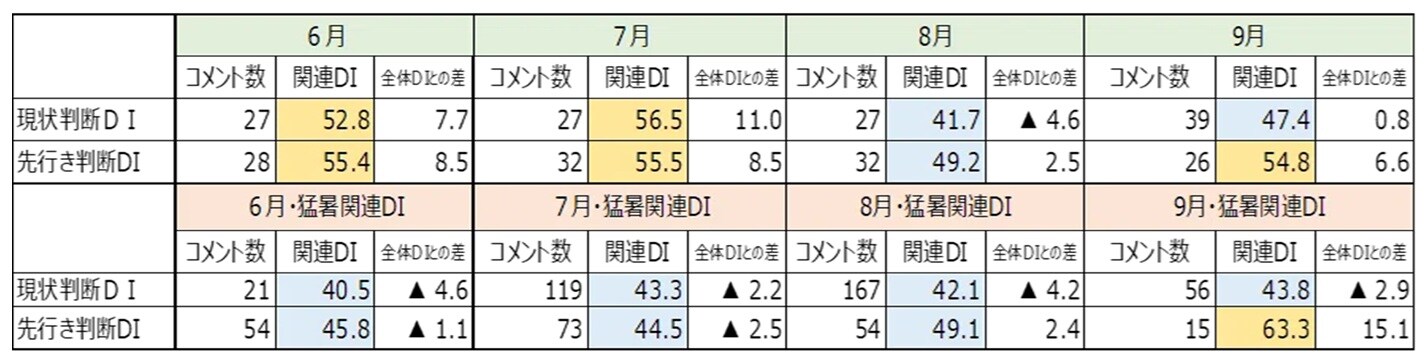 9月の「気温」関連現状判断DIは47.4、先行き判断DIは54.8と、8月「気温」関連現状判断DI 41.7、先行き判断DI 49.2を上回りました。