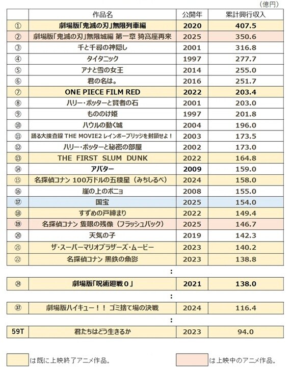 ※背景で色がついているのは公開年が2020年以降のアニメ映画。