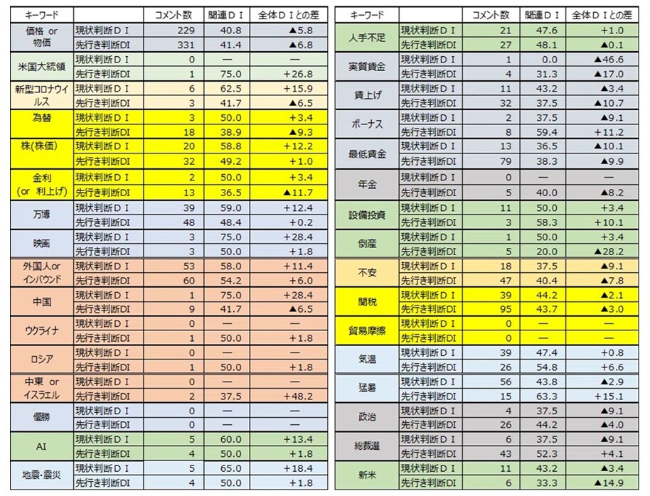 「価格or物価」関連現状判断DIは依然景況感の下振れ要因ですが、DIの微増とコメント数の減少基調から影響はいくぶん軽微になっているようです。