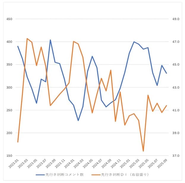 9月の調査期間中(9月25日~30日)に自民党総裁選の演説会や政策討論会が開催され政治に関する関心が高まったことで「政治」や「総裁選」の先行き判断に関するコメントは、各々26名、43名になりました。9月「政治」関連先行き判断DIは44.2、9月「総裁選」関連先行き判断DIは52.3です。
