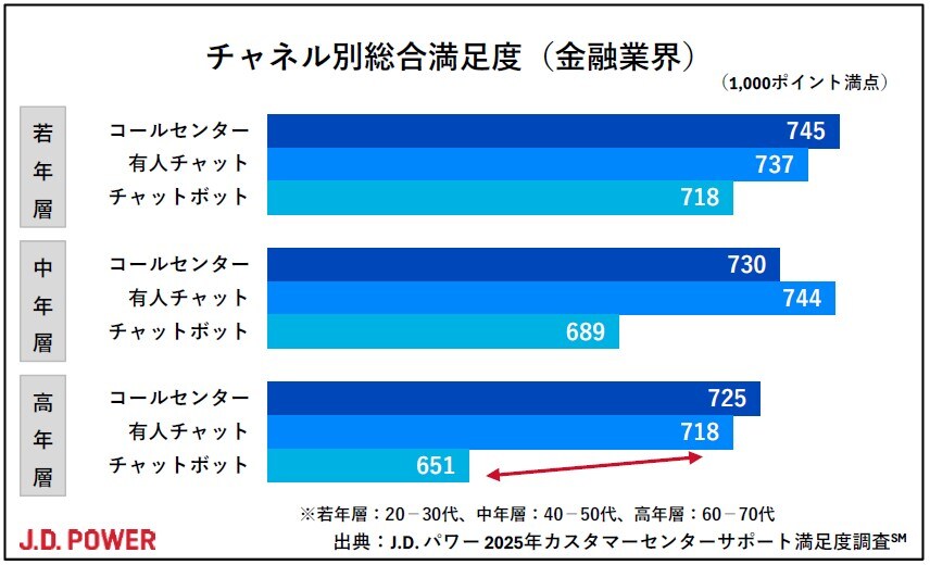 金融業界におけるチャットボットの満足度は、コールセンターや有人チャットに比べて低く、とりわけ高年層で顕著に低くなっていることが明らかになった。