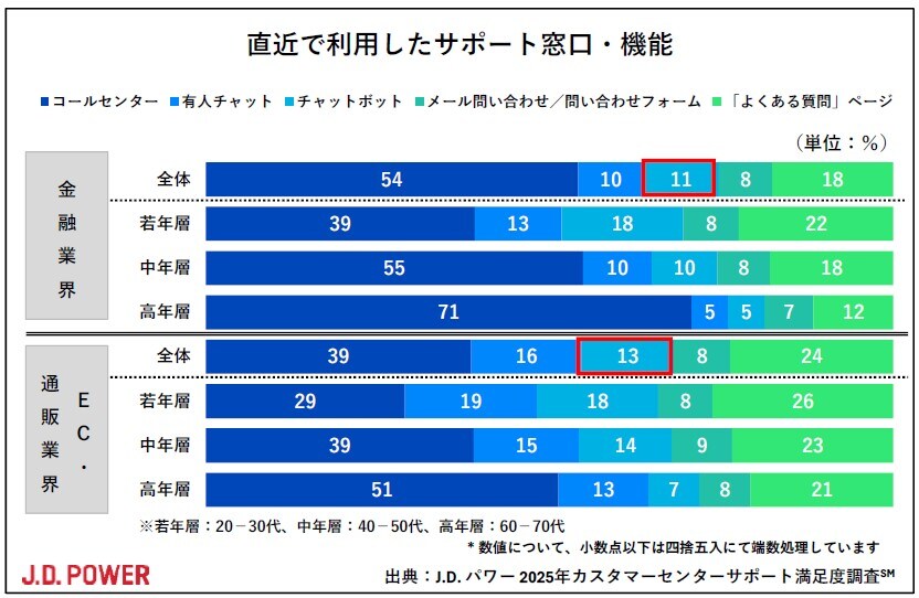 一方で、高年層(60-70代)では依然としてコールセンターが主要チャネルとして定着しており、特に金融業界においては直近で利用したチャネルのうち7割以上を占めた。