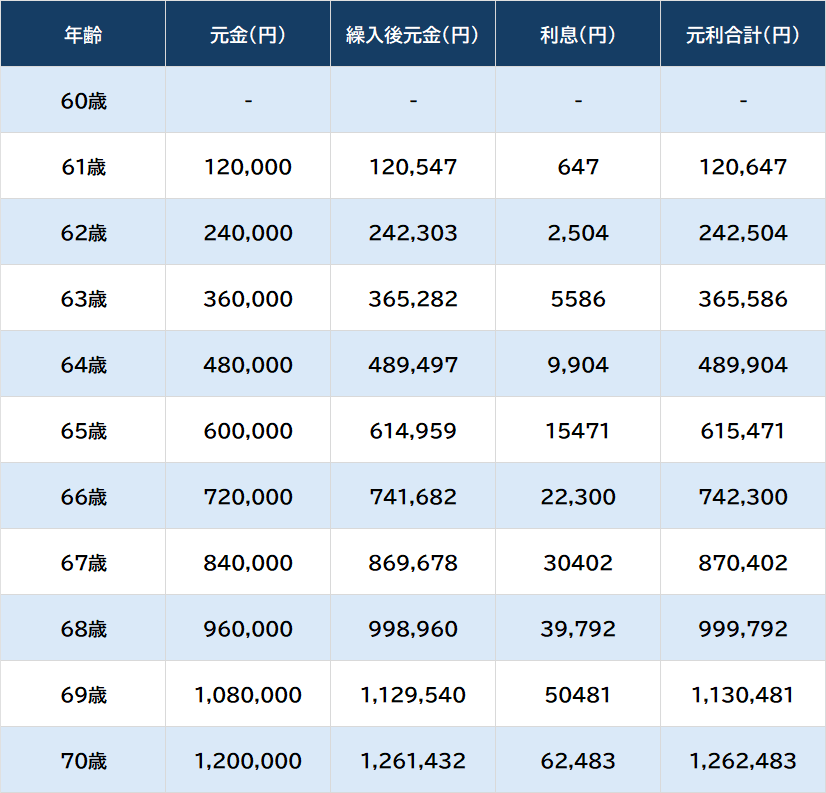 エトセトラ 統計 シェア Tweet [連載] 統計から紐解く日本の実情…統計・調査・ランキング資料 【早見表】60歳から月1万円を積み立てたら、70歳でいくらになる?年利1%~5%まで早分かり SGO編集部(投資研究会) 2025.10.21 統計 調査 60歳から月1万円を積み立てた場合(年利1%の場合) ※福利方式:月複利、利息組込:期初、課税方式:非課税として算出