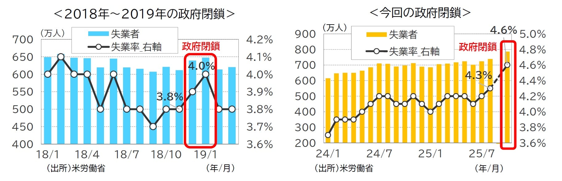 今回は一時帰休が75万人とされており、労働力人口が一定であることなどを前提とすると、失業率は政府閉鎖前(8月)の4.3%から10月には4.6%へ急上昇する計算になります。