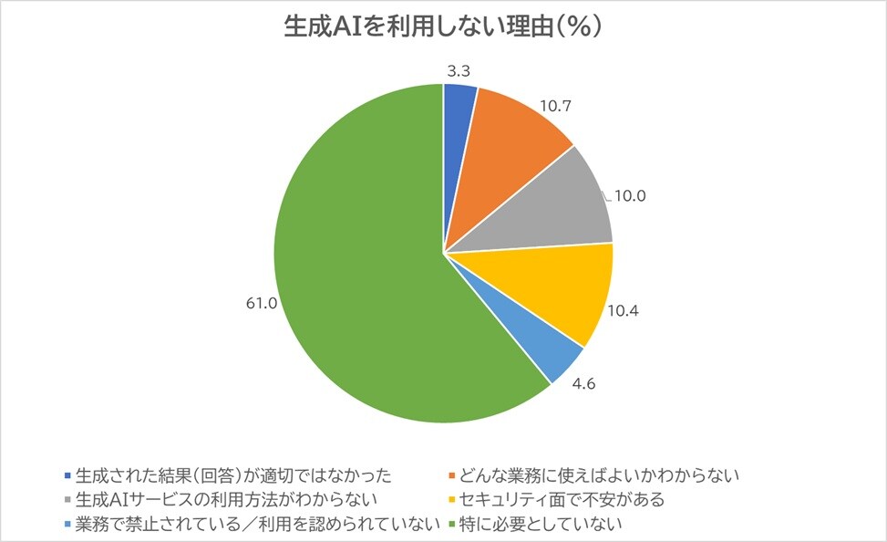 このほか、「どんな業務に使えば良いかわからない」(10.7%)、「生成AIサービスの利用方法がわからない」(10%)との回答もあった。生成AIのサービスではプロンプト(AIへの指示文)などの作成が必要で、AIに関する一定の知識やリテラシーが必要になることが多い。このため、活用に踏み切れない人も多いようだ。一方で「生成された結果が適切ではなかった」と答えた人は3.3%に過ぎなかった(図表1)。