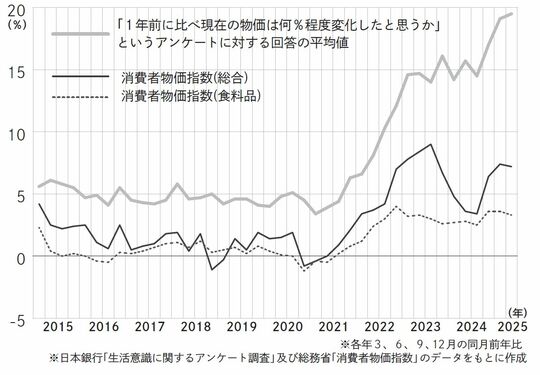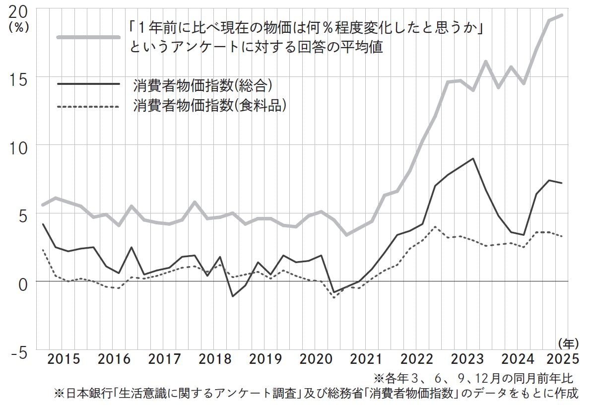 興味深い指標をもう一つ紹介します。それは、「体感」指標です。日本でも、2019年12月に、経済産業省が、「消費者の購買心理や体感物価を捉える新たな指標を開発しました」と発表していますが、「体感」は、消費者の購買心理や体感物価などを捉える新たな指標です。たとえば、日本の消費者物価指数は、2023年から2024年にかけて、降下しています(図表1)。しかし、国民の「体感」としては、ほぼ高止まり状態であることが見て取れます。