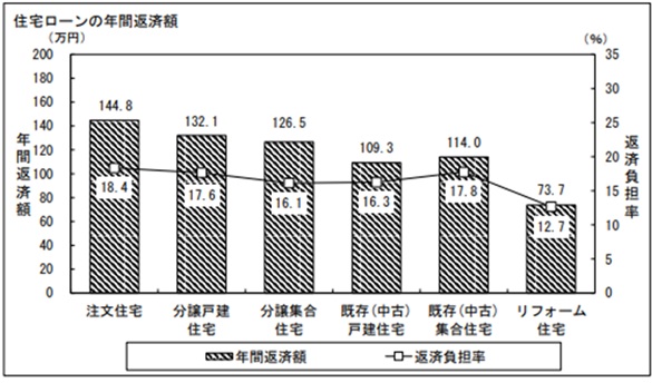 国土交通省の「令和6年度住宅市場動向調査報告書」によると、中古戸建て住宅購入世帯の「住宅ローン平均年間返済額」は109.3万円、返済負担率は16.3%です。