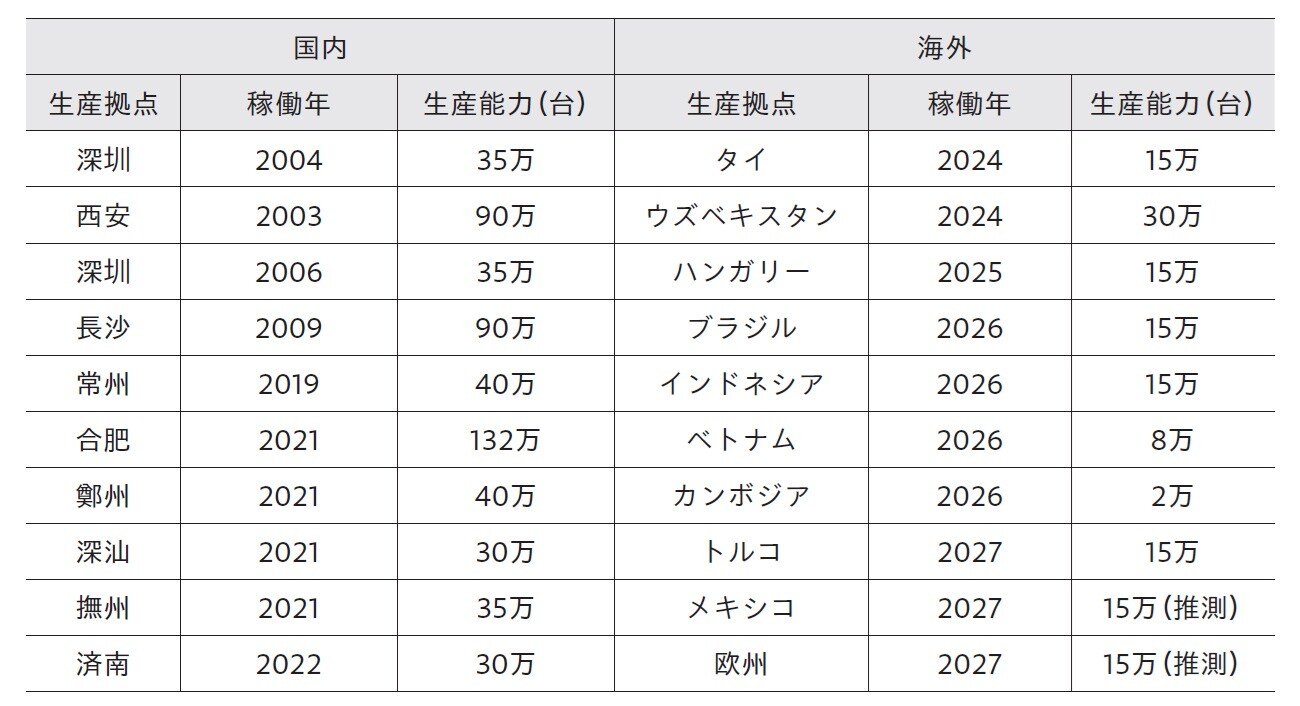 2025年3月時点で、BYDは中国国内に11の乗用車生産拠点を持ち、海外に8拠点を展開し、NEV年産能力は2025年末に550万台に達し、2027年には800万台(海外を含む)を超える見込みだ【図表3】。