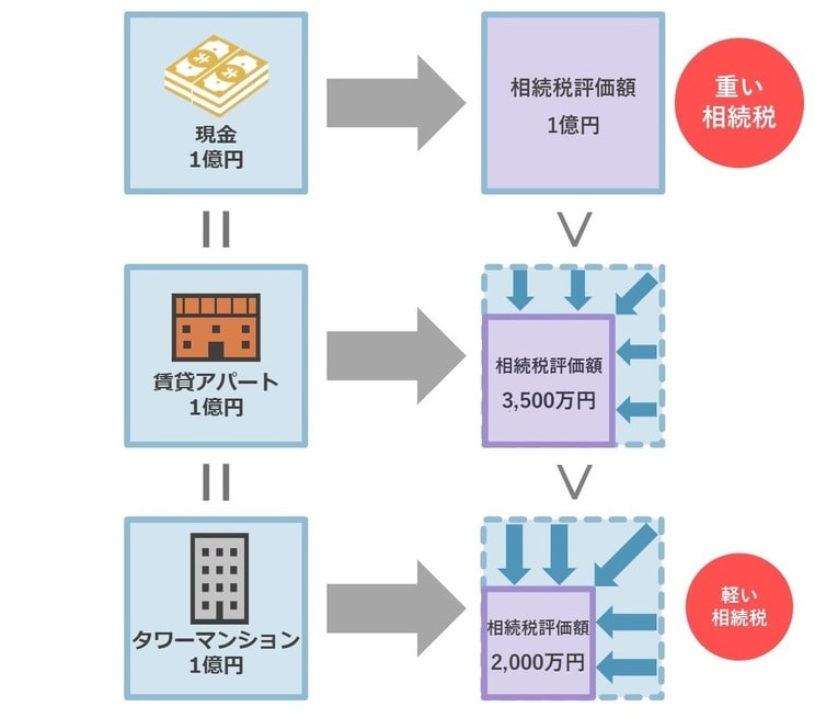 評価額を下げる手法のひとつが、「資産の組み替え」です。たとえば、金融資産を不動産に組み替えると、相続税評価は大幅に下がります。特に、賃貸用のタワーマンションなどを保有している場合、評価額は実際の市場価値の約5分の1程度に抑えられることがあります。