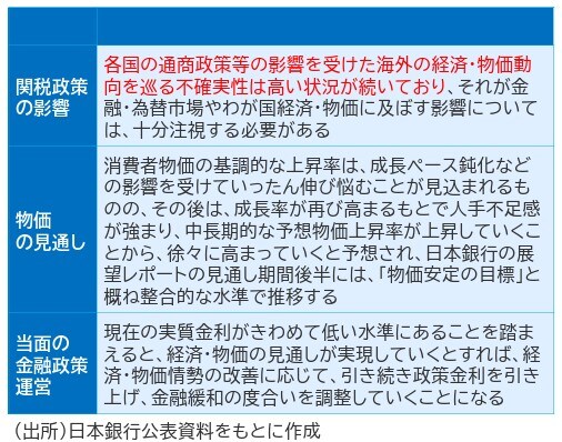 特に、関税政策の影響については、「各国の通商政策等の影響を受けた海外の経済・物価動向を巡る不確実性は高い状況が続いている」と述べており、早期利上げに前向きな様子は窺えませんでした。