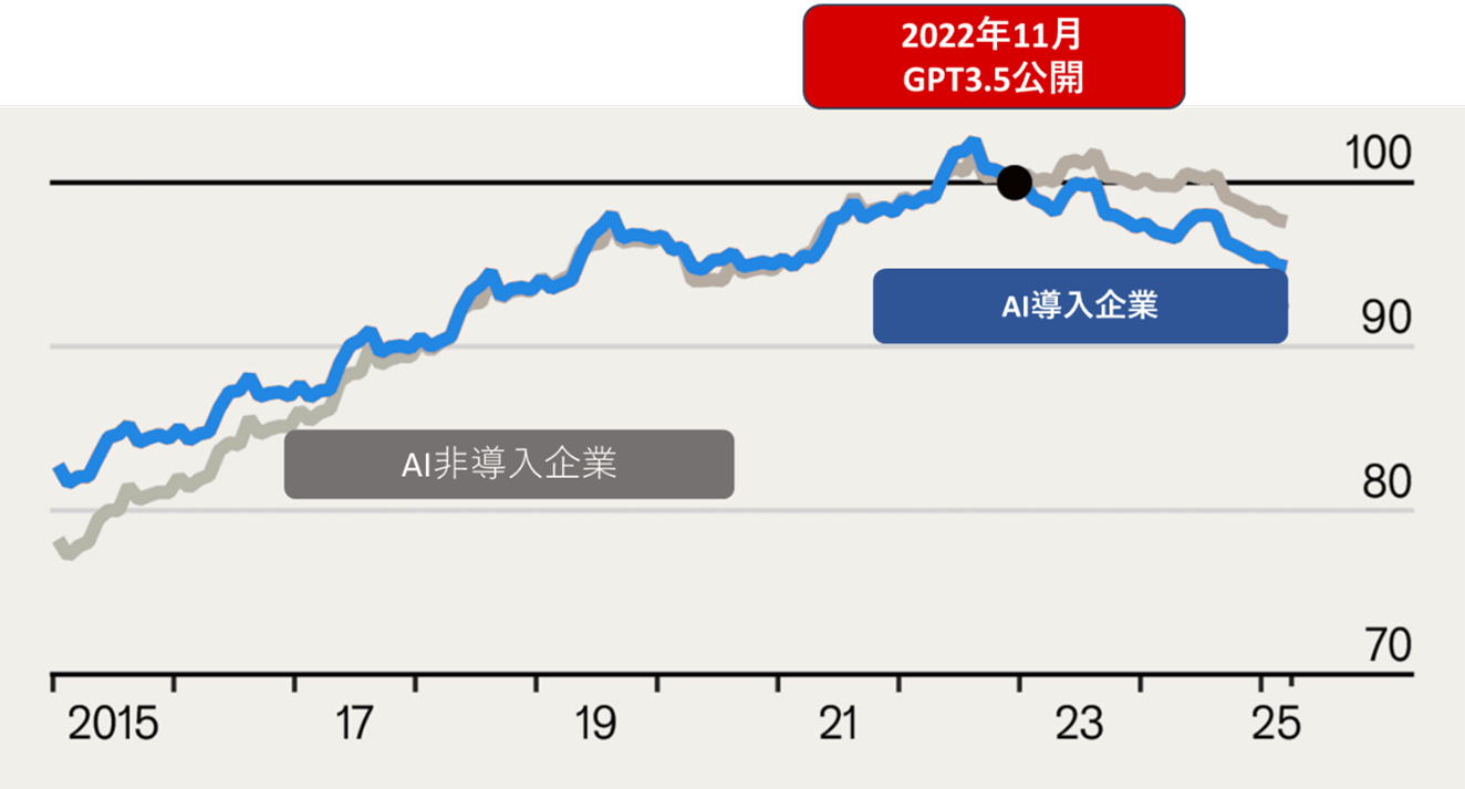 もう一度要約すると、業務にAIを導入した企業は、AIを導入していない企業に比べて若手の採用が急減しているのである。これまで若手にやらせていた仕事をAIに振っているから、もう若手を採用する必要がないということだ。