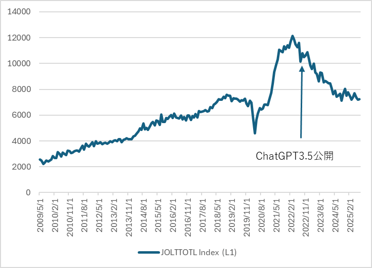 米国の求人件数がピークアウトしたのは2022年3月。その約半年後にChatGPT3.5がリリースされた。そこから米国の求人件数は減少の一途をたどっている。