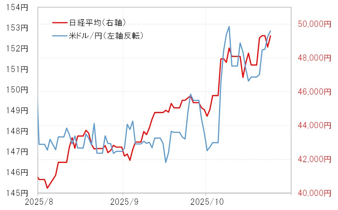 まずは日米首脳会談について。高市新総理とトランプ大統領は保守派同士で、外交や安全保障などの政策では親和性が高い関係との見方が一般的です。その一方で、経済政策においては、トランプ大統領は貿易相手国の通貨安に過敏に反応するのに対し、高市総理がいわゆる「アベノミクス」継承として円安に寛容と見られることから、高市政権発足後150円を超えた水準での米ドル高・円安が続いているなかでは、対立するリスクがあるのではないでしょうか。
