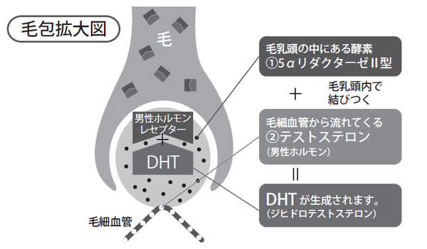 毛包の中にはⅡ型5αリダクターゼという酵素が存在します。一方、毛細血管の血中にはテストステロンという男性ホルモンが循環しています。この2つが毛乳頭部分で出会い、結びつくと、「DHT(Dihydrotestosterone=ジヒドロテストステロン)」という物質が生成されます。