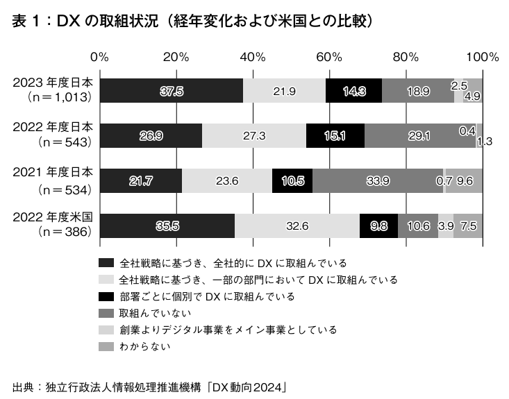 「DX動向2024」(独立行政法人情報処理推進機構)を見ると、7割以上の企業が何らかのかたちでDXに取り組んでいると答えています(図表)。そのうち「成果が出ている」と回答した割合は約6割でした。