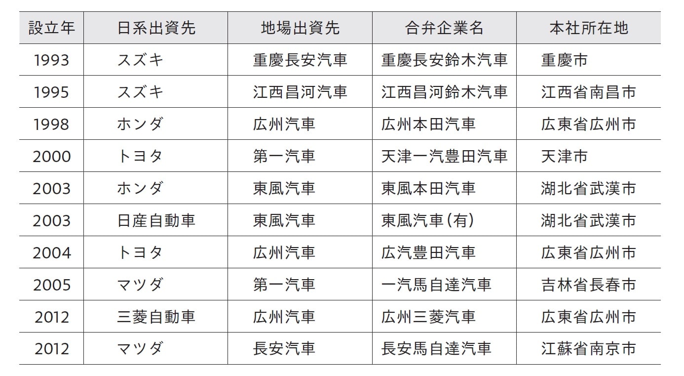 日本の自動車メーカーは、1980年代に地場企業に対する技術供与の形で中国事業をスタートし、1993年から2004年の間に、スズキ、ホンダ、トヨタ、日産、マツダがそれぞれ乗用車合弁企業を立ち上げ、本格的中国展開をスタートした。