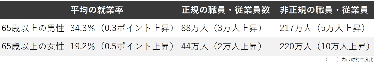 総務省「労働力調査(2024年度平均)」によると、65歳以上の就業者数は前年度より全体で20万人増加しています。