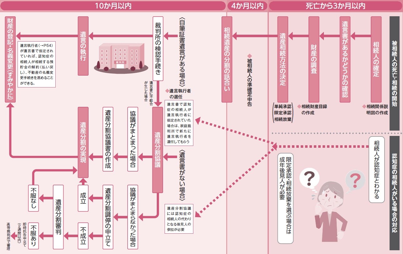 遺産相続手続きに関しても、認知症の相続人がいる場合は成年後見人が必要になります。まずは一般の遺産相続との比較のなかで一連の流れを把握し、もしもの事態が起こった際に備えましょう。また、引き継ぐ財産がどれくらいあるのかを事前に把握しておくことも大切です。