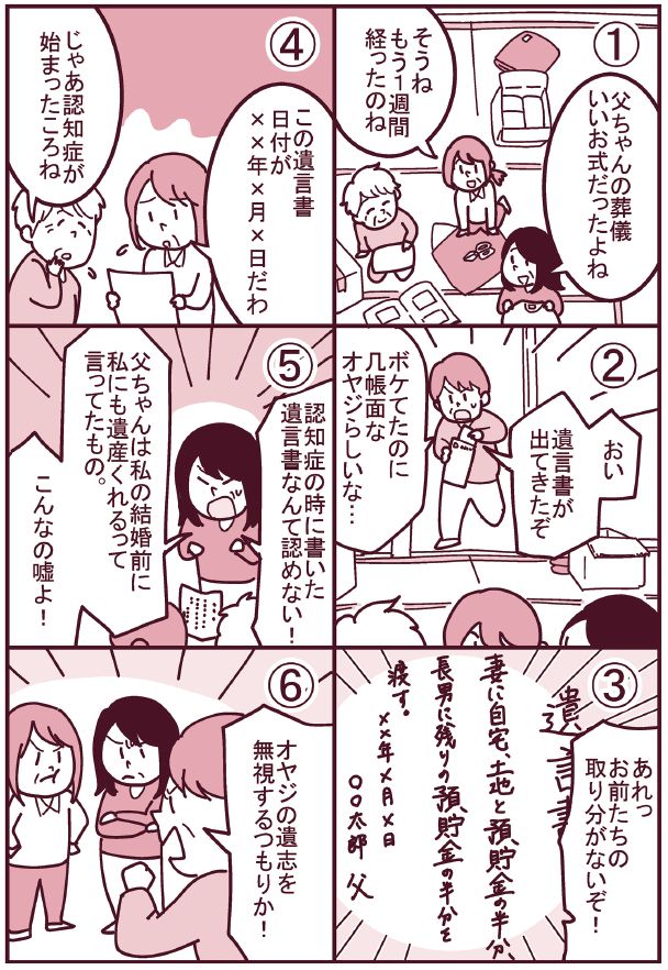 遺留分については、特に認知症の相続人がいる相続に限った問題はありませんが、たとえば父親が遺言で、「妻には十分な財産があるので、私の財産は長男と長女に相続させる」と書き、その通り分割するとします。その後、認知症である母親に後見人がついた場合には、「遺留分侵害額請求」を起こされる場合があります。後見人の任務は、被後見人の財産を守ることだからです。